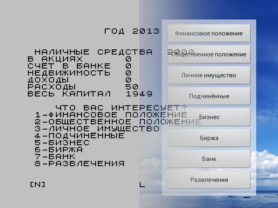 基於老式文本的策略。該遊戲是舊俄羅斯ZX Spectrum遊戲的翻拍,這也許也是某人的翻拍。 =)球員的任務 - 在一個神話般的國家中從底部升起並成為總統。